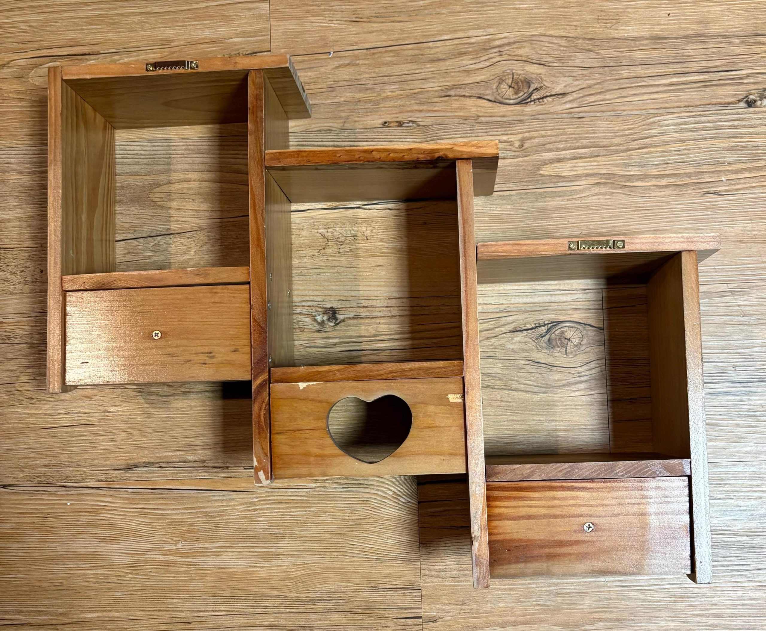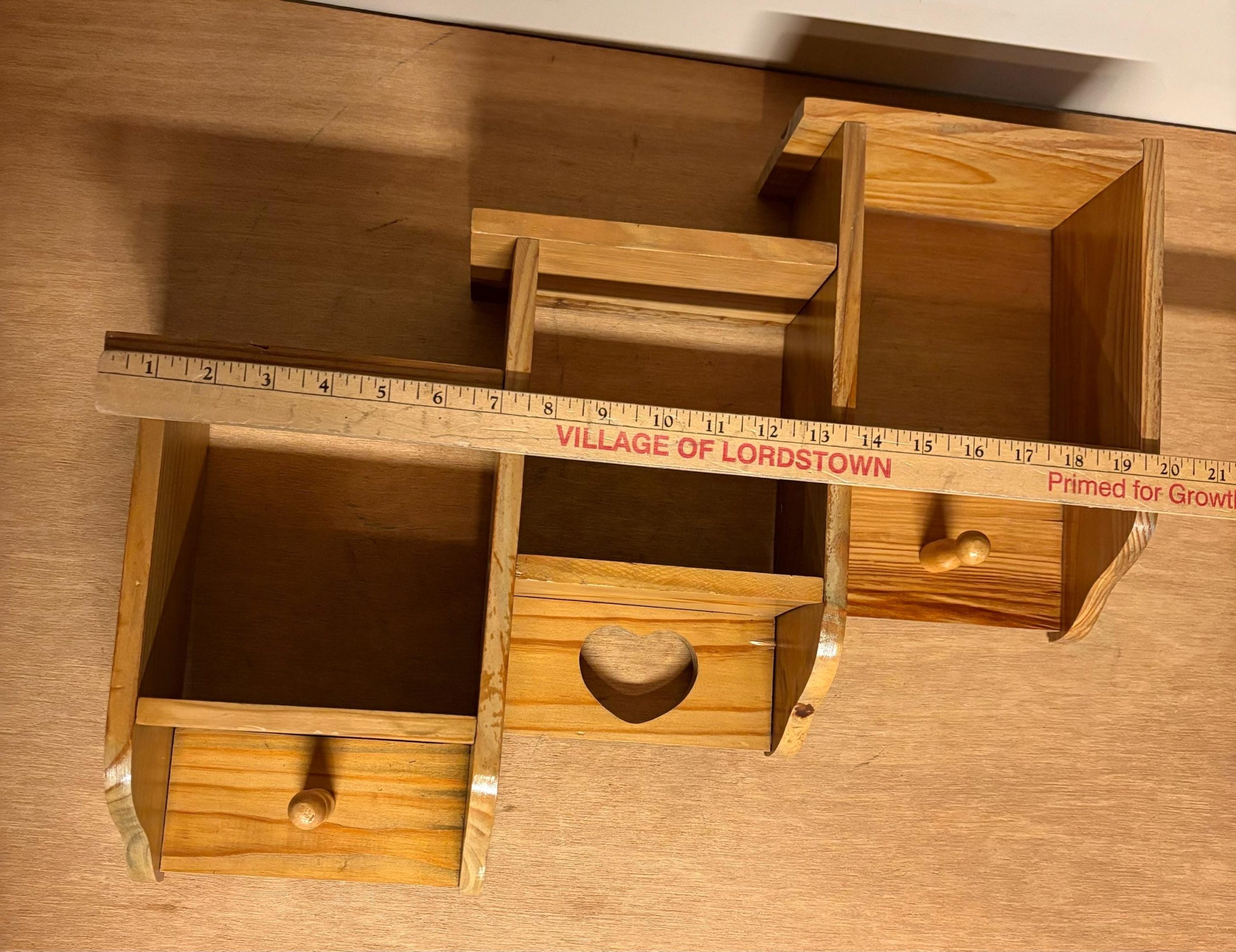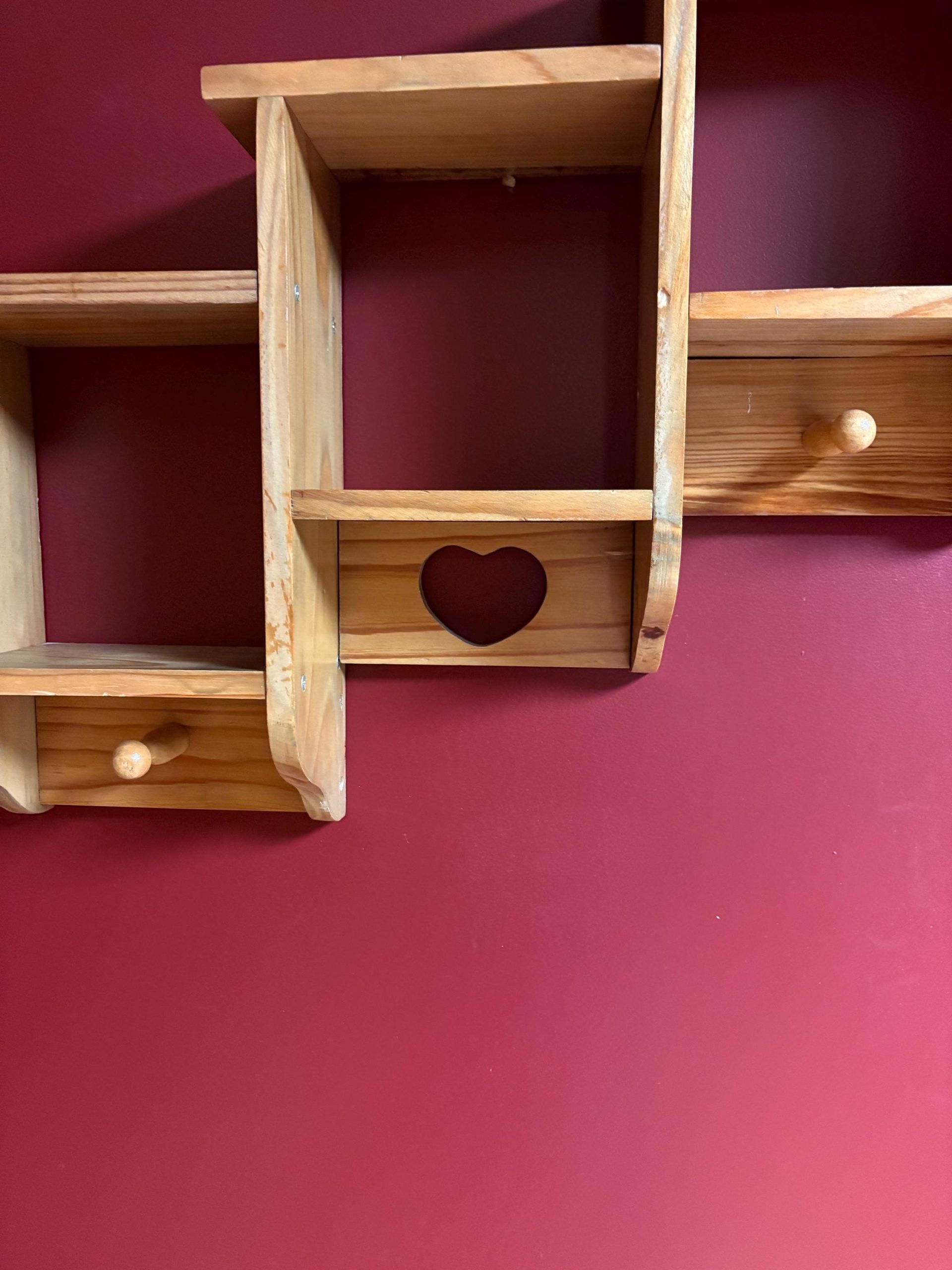 3 Tier wood 6 shelf with heart and pegs 20” x 16 1/2” X 4”