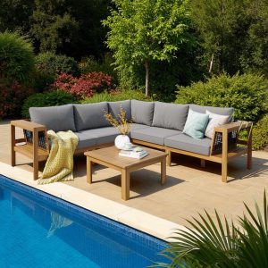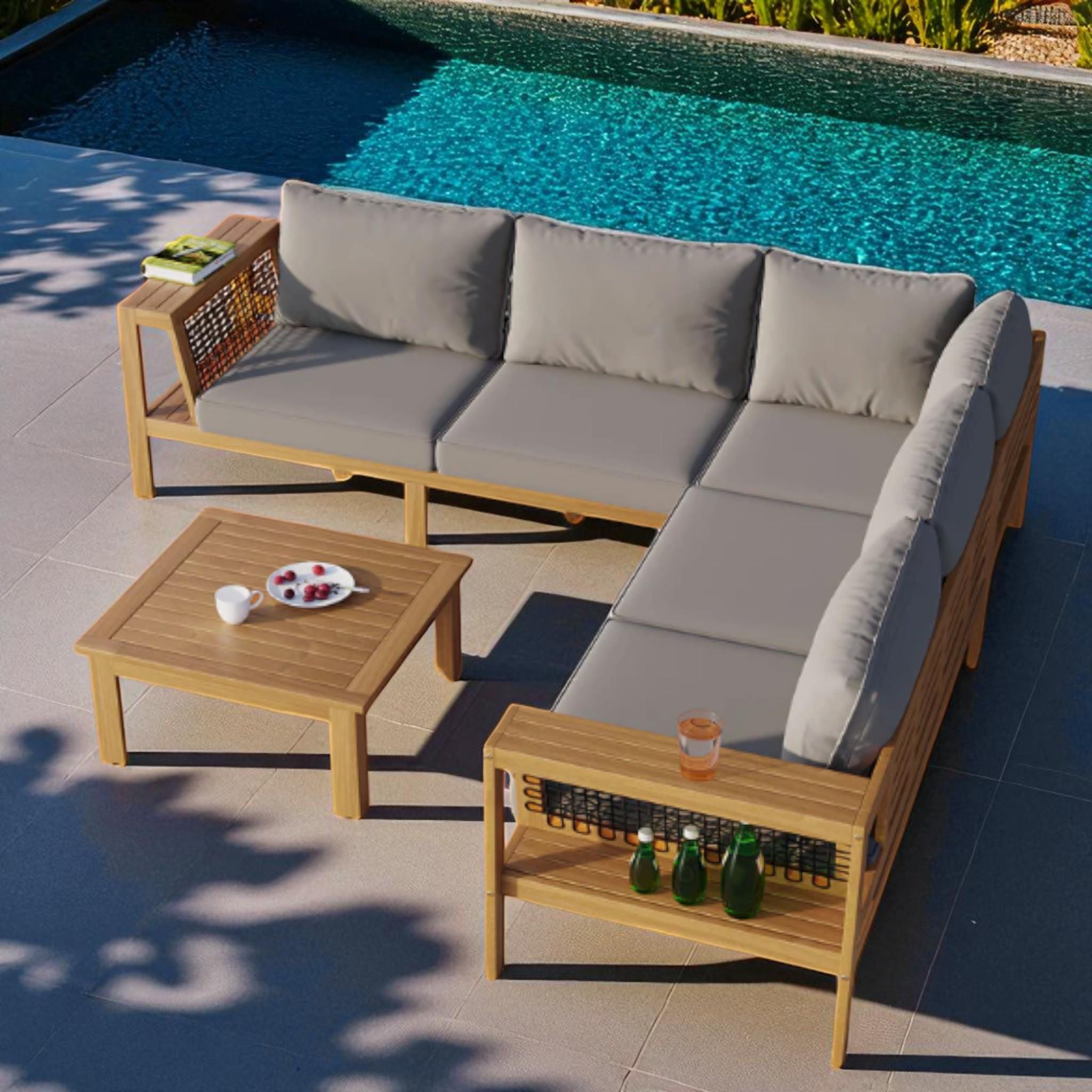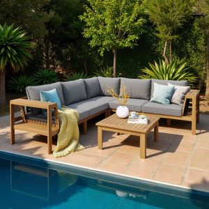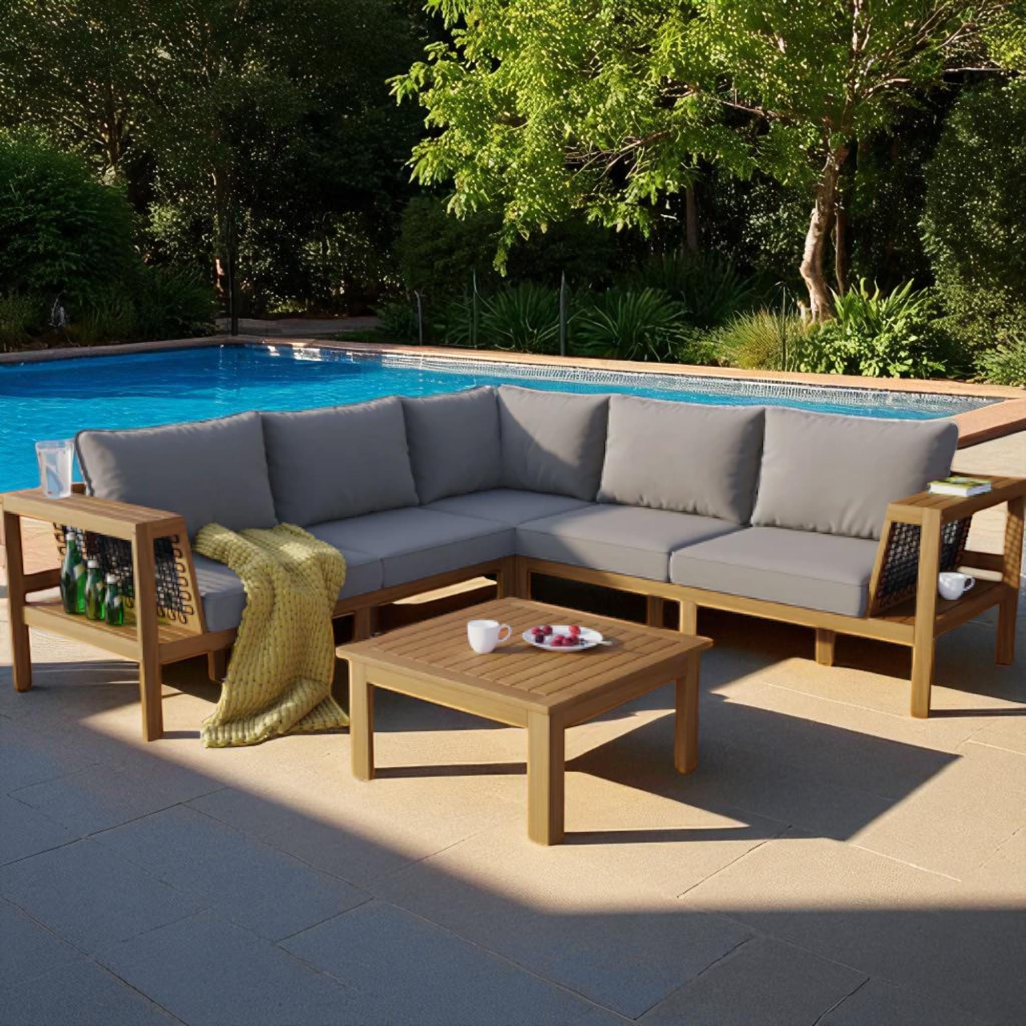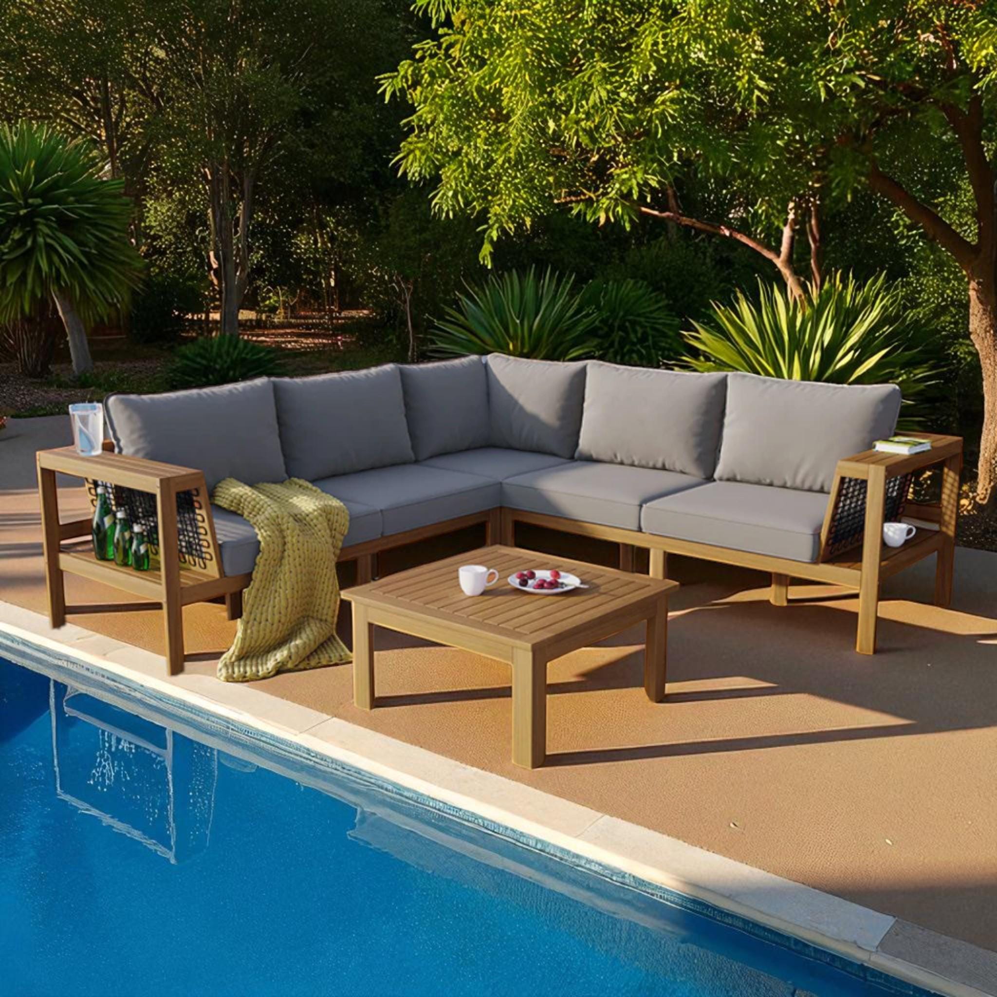 🌞 Relax, lounge, and entertain in style with this elegant L-shaped 4-piece wood patio sofa set! Featuring a spacious corner sofa with plush cushions and a matching coffee table, it’s perfect for making the most of your garden, deck, or balcony. 🌿🛋️