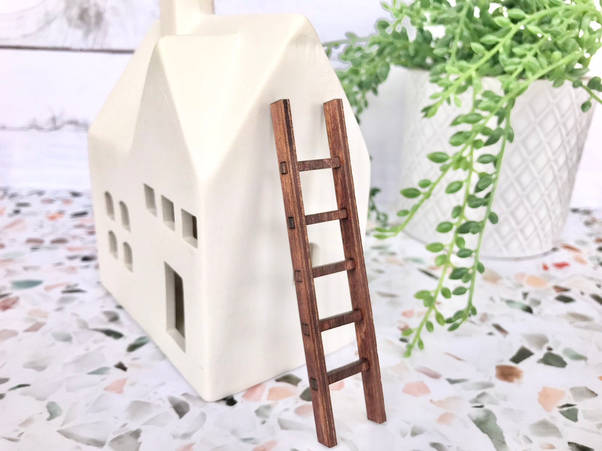 The Mossy Knoll’s unique handmade miniature farmhouse style ladders are the perfect addition to any window sill, planter, desk, shelf or tiered tray.