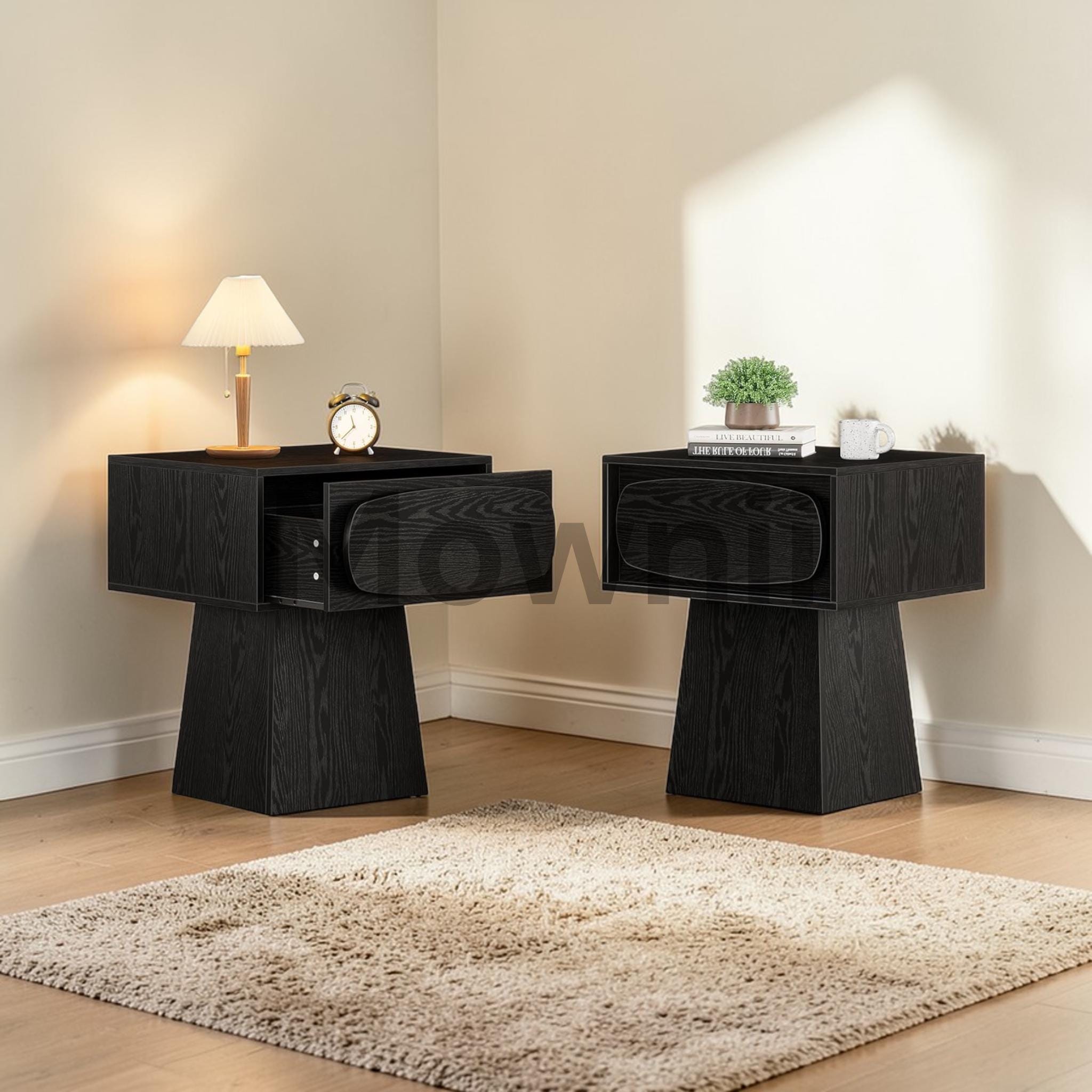 At Mownii, we believe great furniture should be beautiful, functional, and built to last. This black nightstand set of 2 is crafted with attention to every detail — from the wood grain finish to the curved handles — bringing lasting value to your home.
