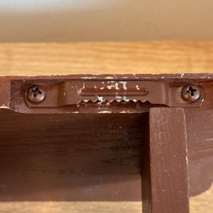 Vintage wood shelf with hand cut bracket details and aged patina, solid wooden wall mounted display shelf.